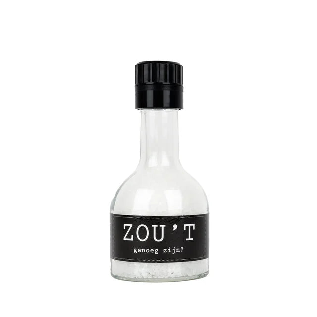 Grove zeezout. Een noodzakelijk ingrediënt in iedere keuken met een handige molen om het zout fijn te malen voor gebruik. Op het zwarte etiket staat de tekst 'Zou't genoeg zijn?'. Een geweldig kado voor bijvoorbeeld een nieuw huis!