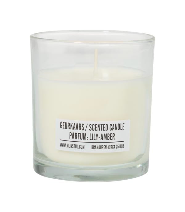 Entdecken Sie den neuen Look der Duftkerze Lily Amber! Diese stilvolle Kerze im transparenten Glasbehälter verleiht jedem Raum einen Hauch von Eleganz.