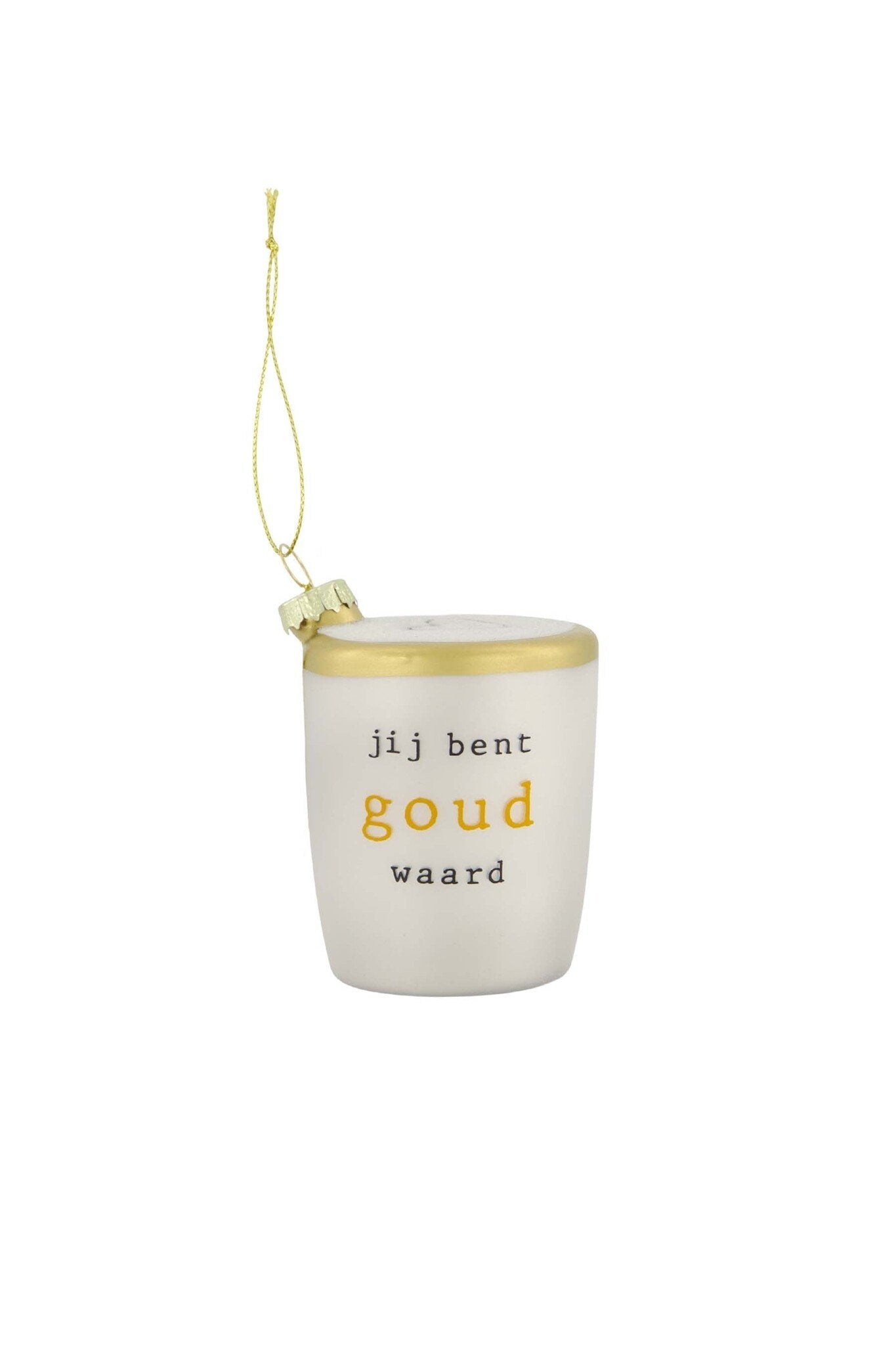 Niedlicher Weihnachtsschmuck in Form einer Kaffeetasse mit dem Text „Du bist Gold wert“