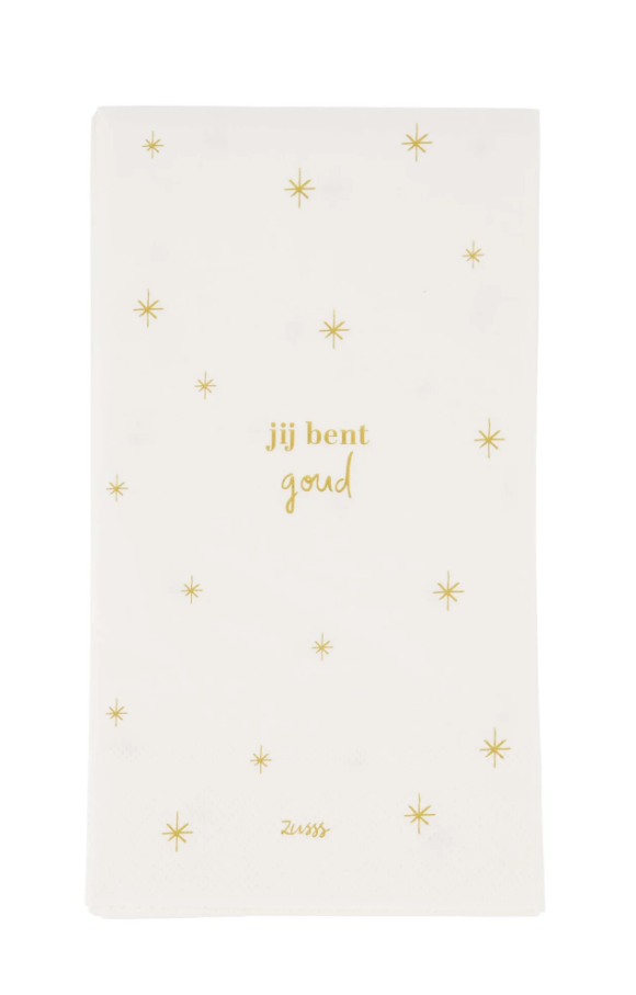 Diese Zusss-Servietten mit goldener Schrift und Sternen sorgen im Handumdrehen für eine festliche Atmosphäre am Tisch. Die Servietten mit dem Schriftzug „You Are Gold“ und dem sanften weißen Hintergrund mit goldenen Details machen jeden Anlass zu etwas Besonderem. Ob für eine Geburtstagsfeier oder ein gemütliches Abendessen – diese Servietten verleihen jedem Tisch eine dezente, warme Note. Der Golddruck wirkt stilvoll, ohne aufdringlich zu sein.