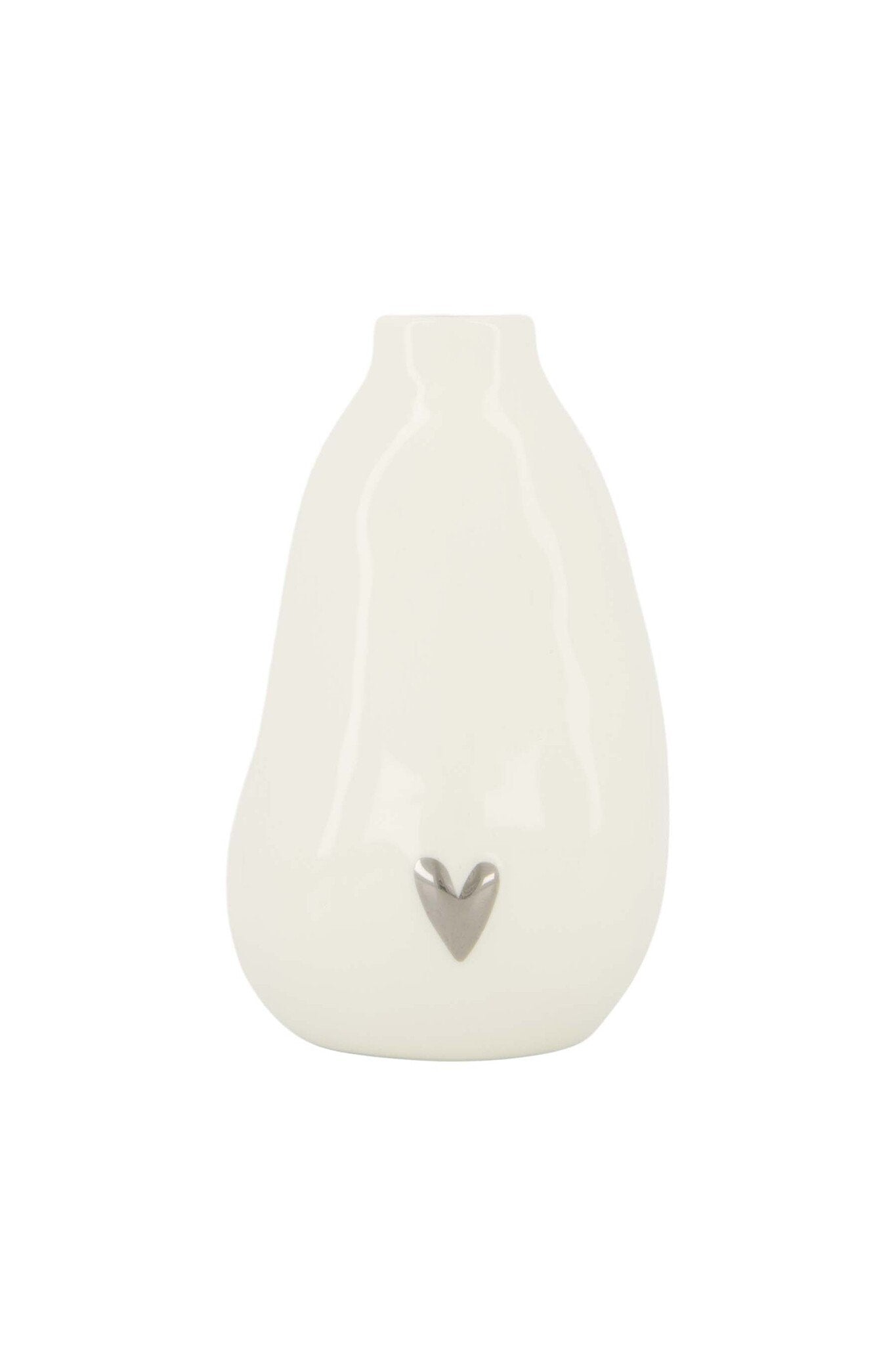 Die Keramikvase Zusss mit Herz ist ein dezentes Wohnaccessoire, das Ihrem Wohnzimmer Wärme und Gemütlichkeit verleiht. Die weiße Vase mit dem silbernen Herz auf der Vorderseite wirkt sowohl einzeln als auch in Kombination mit anderen Dekorationsgegenständen wunderschön. Die Keramik hat einen sanften Glanz und eine organische Form, die sich perfekt für Trockenblumen oder kleine Zweige eignet. Mit dieser Vase holen Sie sich ein schlichtes und doch einzigartiges Stück in Ihr Zuhause, das Ihrem Zuhause sofort eine persönliche Note verleiht.