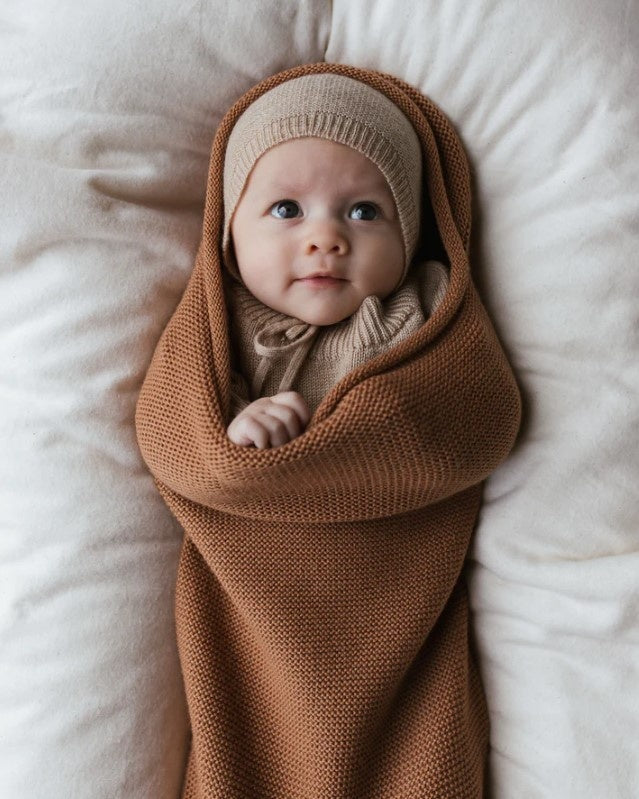 Ontdek de rustgevende omhelzing van de Hvid Cocoon in de warme kleur terracotta. Deze cocon is geïnspireerd op de eeuwenoude traditie van inbakeren en biedt je baby een veilige en comfortabele plek om te ontspannen.