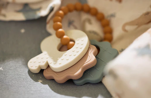Deze siliconen sleutelbos met de kleuren Wild Rose, Sea Green, Caramel en Nougat is een perfect speeltje voor kleintjes die graag dingen in hun mond doen. Ook erg geschikt voor kindjes die last hebben van beginnende tandjes. Het is dan erg fijn voor je kleintje om ergens op te kunnen bijten. De bolletjes ring werkt verlichtend voor beginnende tandjes. Met de siliconenringen maak je de deze leuke bijtring gemakkelijk vast aan de kinderwagen of autostoel.