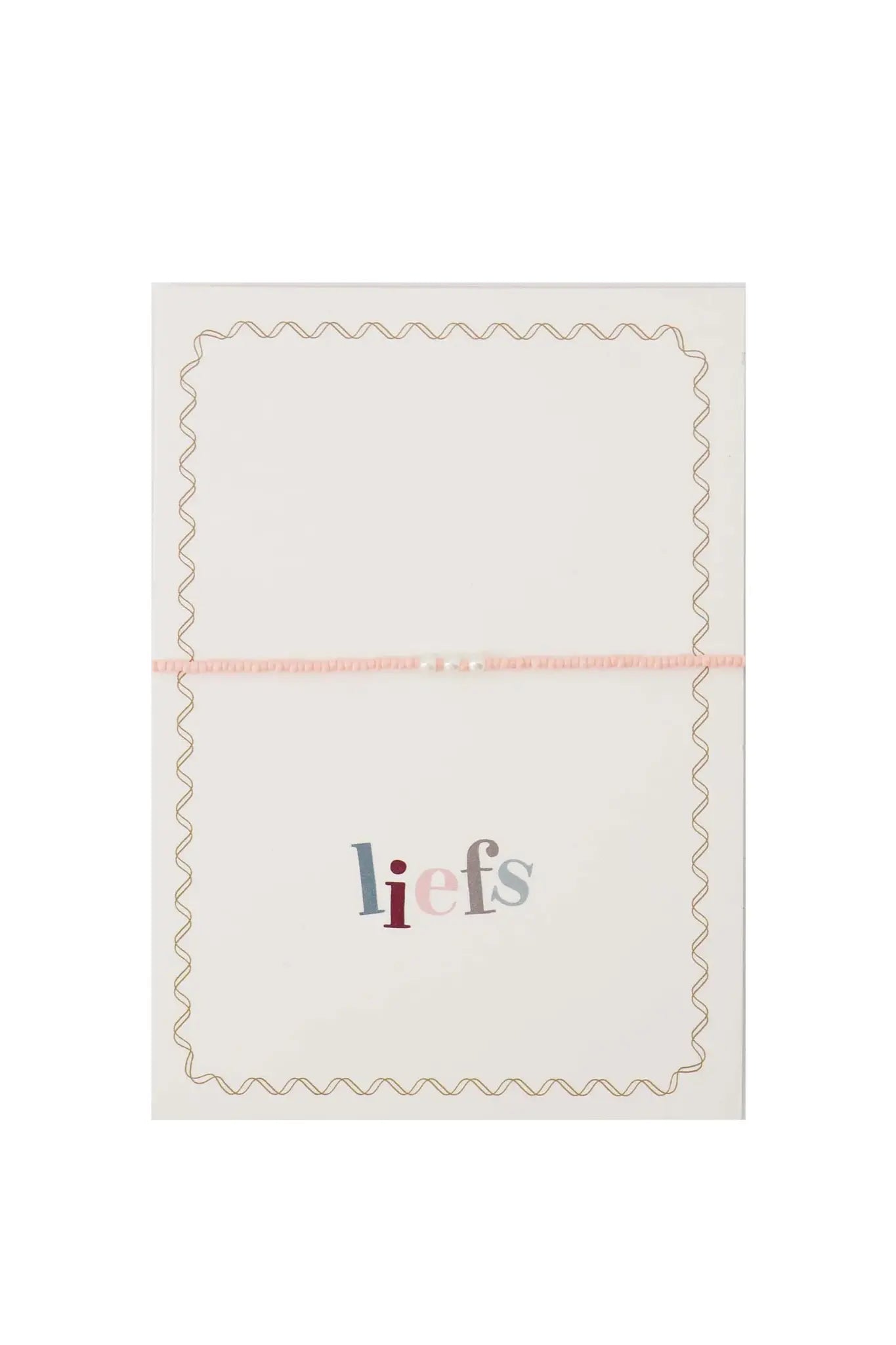 Deze Zusss ansichtkaart armband is een warme manier om een persoonlijk bericht te sturen. De ansichtkaart met het woord ‘liefs’ krijgt door de fijne, multicolor armband een speelse en zachte uitstraling. Het armbandje combineert kleine kraaltjes in een zachte kleur met delicate pareltjes, wat het een subtiel maar bijzonder accessoire maakt. Perfect om iemand te verrassen of jezelf mee te verwennen.
