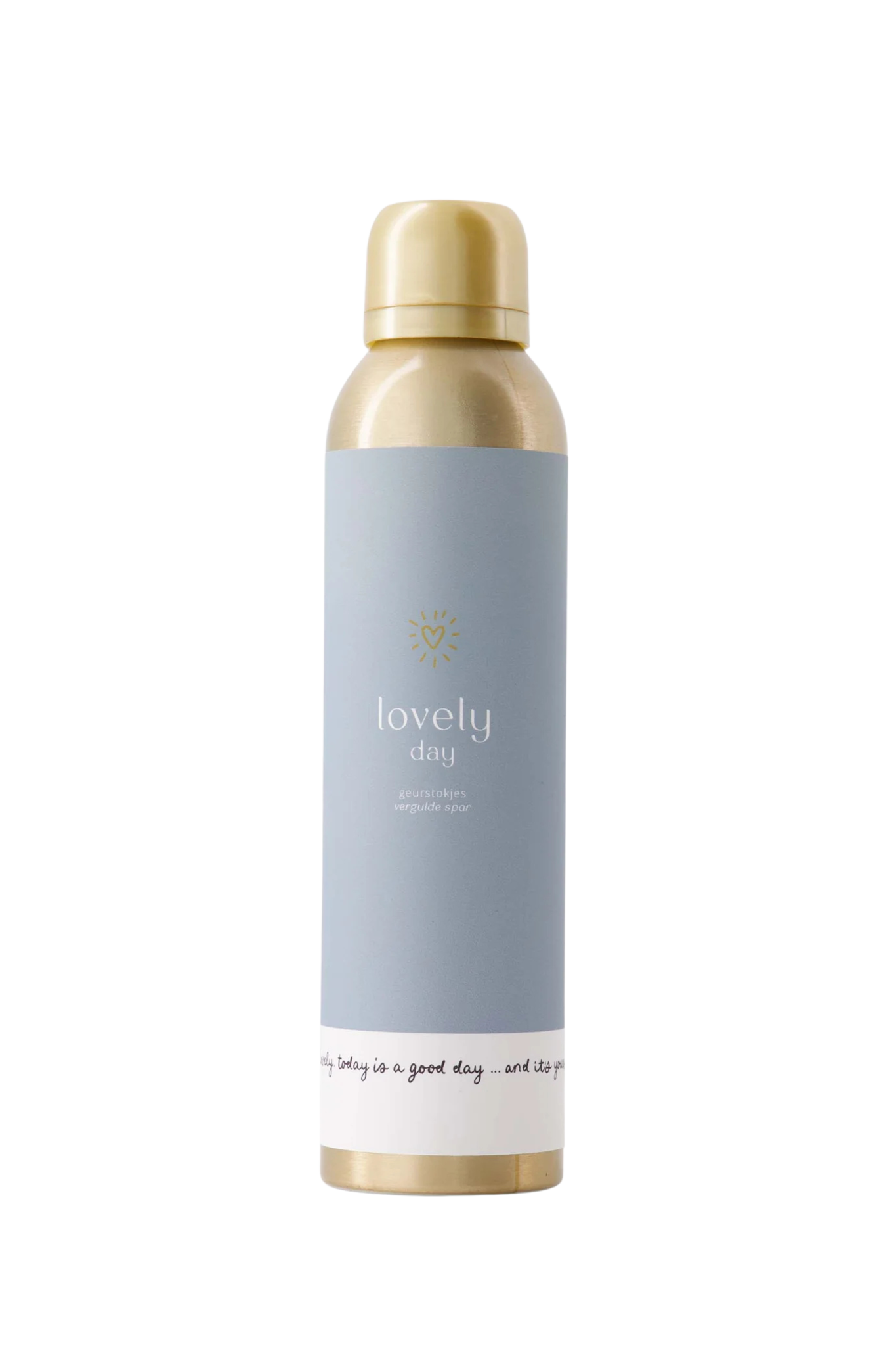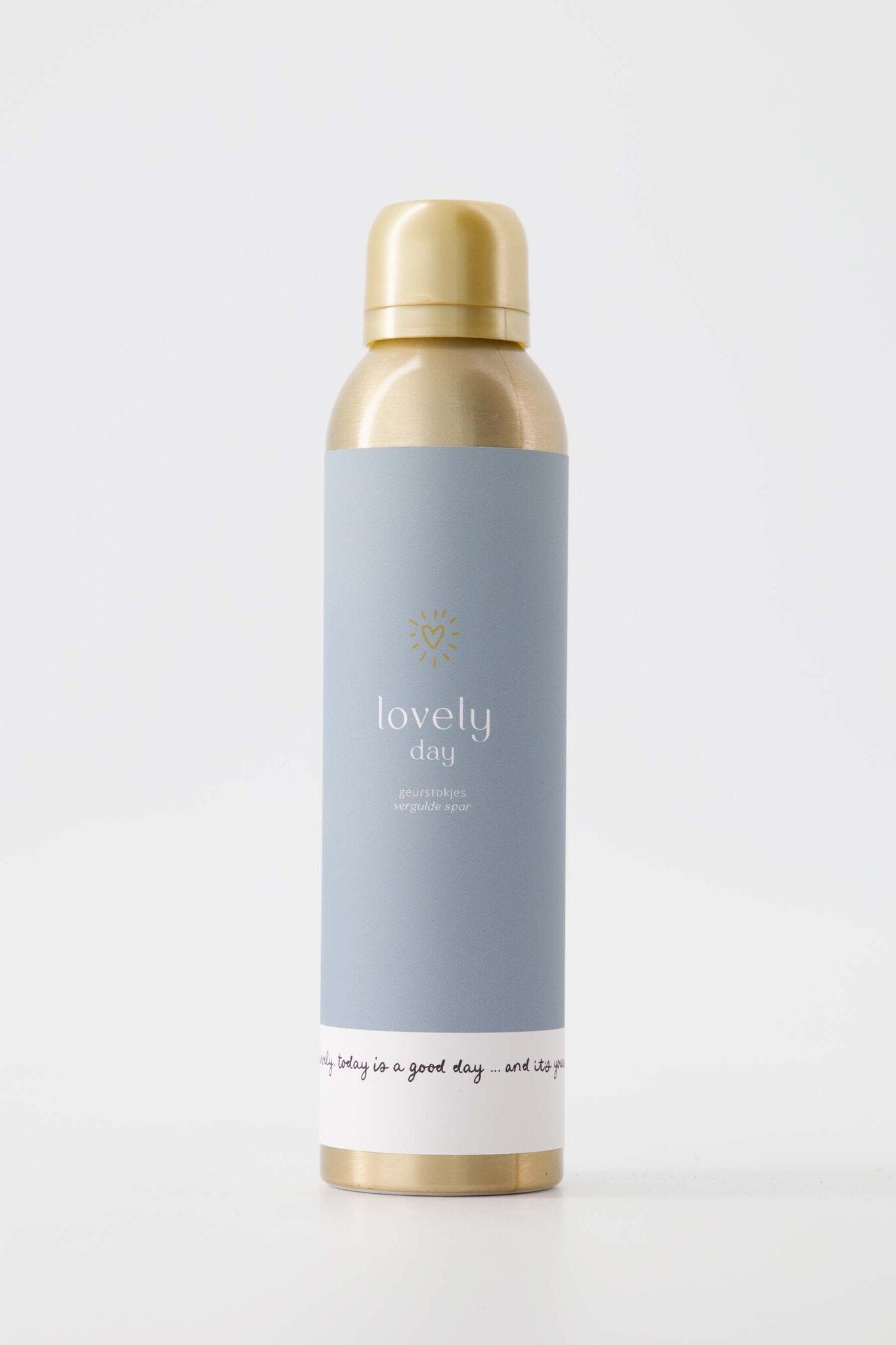 Zusss doucheschuim in een stijlvolle gouden fles met blauwgrijs etiket; zacht schuim met vrolijke tekst Lovely day, ideaal als verwenmoment of cadeautje.