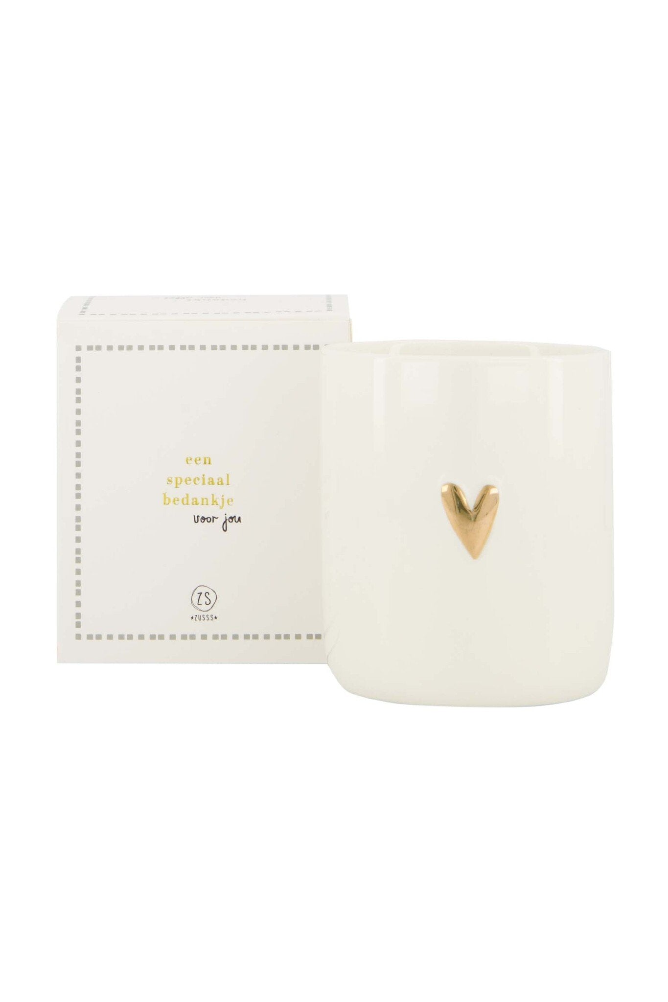 De Zusss geurkaars keramiek is een subtiel en sfeervol cadeau voor in de woonkamer. Deze keramische kaars met een goudkleurig hartje straalt warmte uit en past mooi bij elk interieur. Verpakt in een stijlvol doosje met een lieve bedanktekst, is deze geurkaars een perfect gebaar om iemand te laten weten dat je aan ze denkt. De combinatie van wit, goud en grijsblauw zorgt voor een rustige uitstraling die bij veel woonstijlen past. Ontdek deze geurkaars en breng een moment van rust en dankbaarheid in huis.