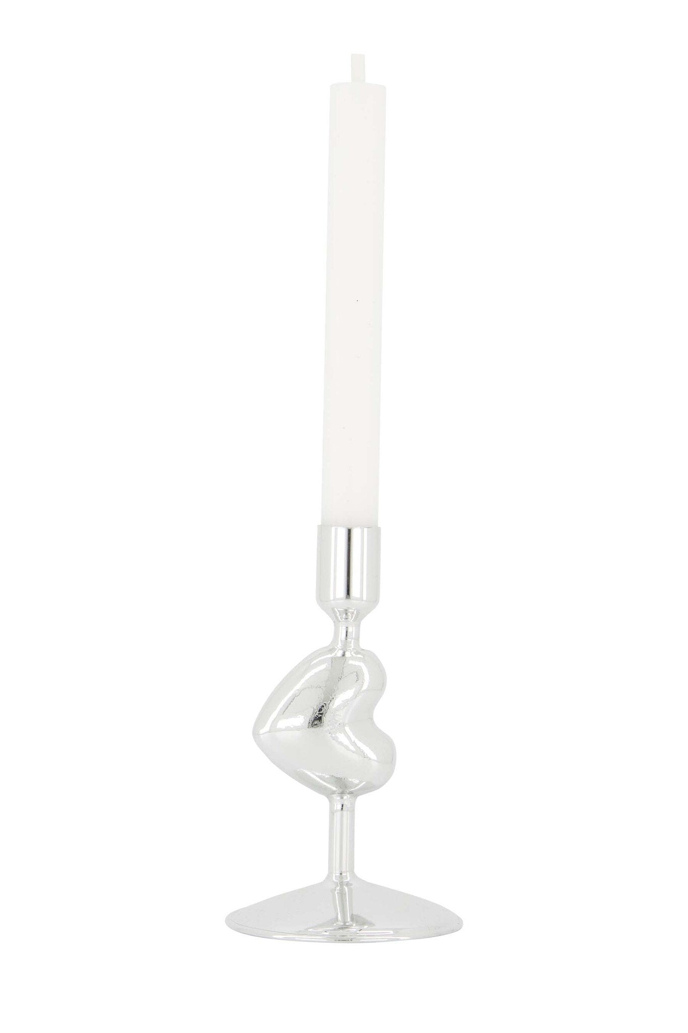 Deze zilveren kandelaar, met zijn speelse hartvorm, is gemaakt van glanzend glas dat een stijlvolle uitstraling aan je interieur geeft. Plaats er een kaars in en geniet van de gezellige ambiance die het creëert. Het is een eenvoudig maar uniek woonaccessoire dat net dat beetje extra sfeer brengt in je huis.