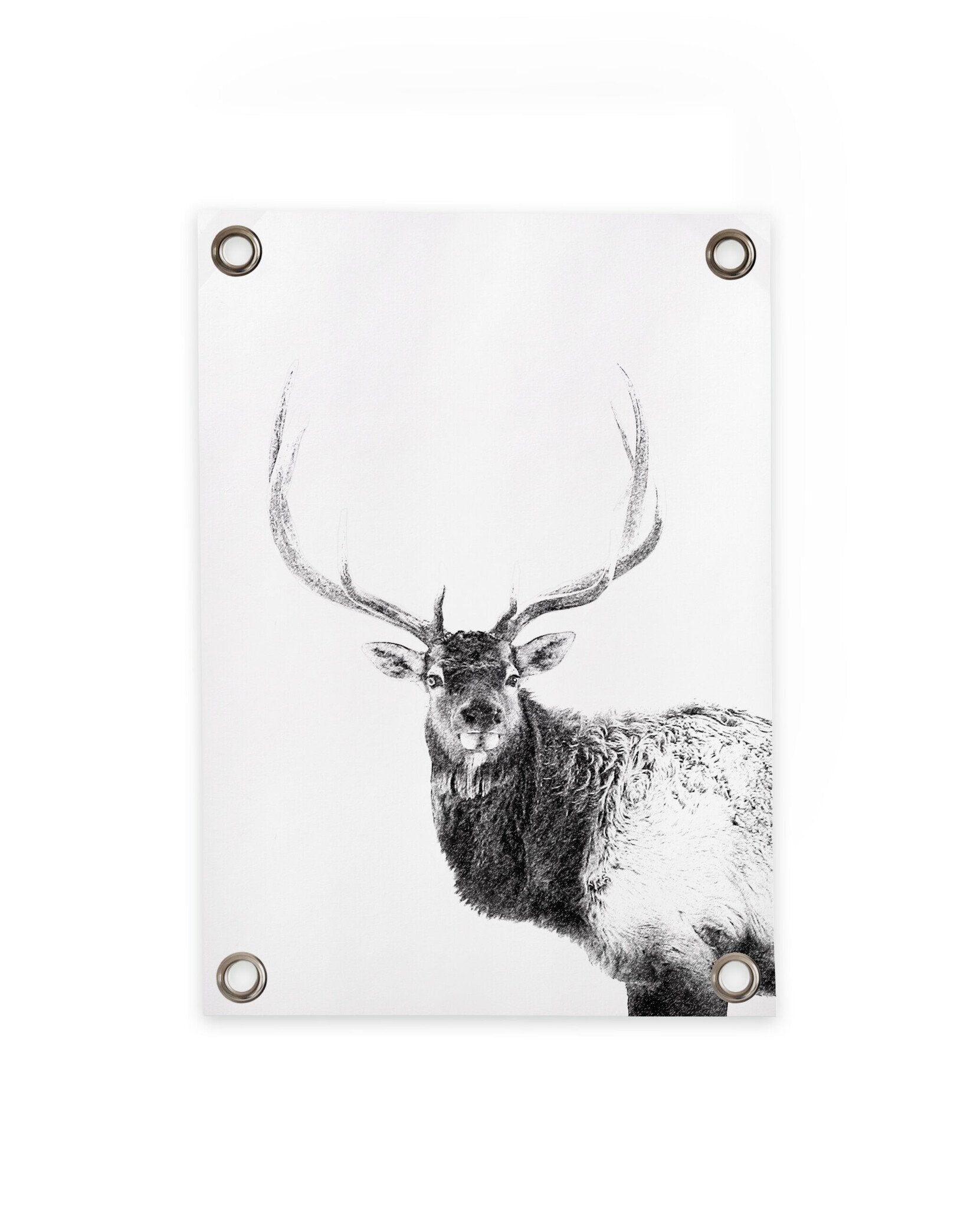 Deze buitenposter is leverbaar in de afmeting 50 x 70 en 70 x 100 centimeter en bevat een stoer zwart wit hert. Omdat je een poster buiten niet eenvoudig met een stukje masking tape bevestigt, is tuinposter hert voorzien van metalen ogen in de vier hoeken. Op deze manier kan je de tuinposter eenvoudig bevestigen aan een muur of schutting. Ook aan een dichtgegroeide haag of om een flinke boom zal de tuinposter supermooi tot z’n recht komen. Uiteraard is de poster ook binnen te gebruiken. Dankzij de stoere metalen ogen voeg je een industriële touch toe aan je interieur!